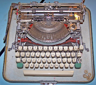 First impression. This is an imposing looking machine. It stands quite tall on my desk and the wide carriage lends to it an almost intimidating air. It has celluloid topped, ringed keys which I like. You always know when your fingers are centered on those. It has a standard QWERTY keyboard layout and like many older machines it uses the lower case "L" for the numeral one. It has manual set tab stops on the carriage. But they are readily accessible on a rail at the top of the carriage. Some machines I have seen make you turn the machine around or flip up a panel to get to the tab stops. This is a heavy machine so I'm glad that spinning it around everytime I want to change the tab stops is not necessary.