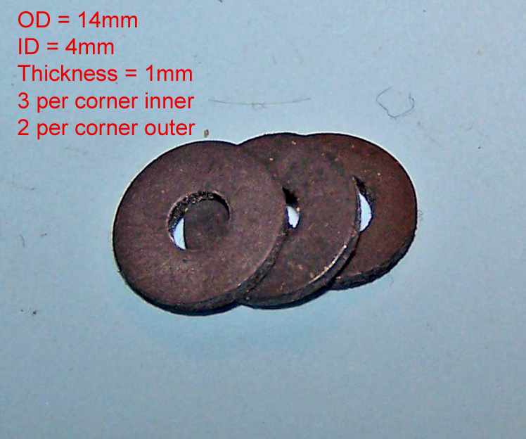 As you can see, the original bushings are slowly turning to goo and will need to be replaced. These actually are not too badly degenerated. At this point I can just remove the screws one at a time and pop out or scrape out the old bushings, slide new ones in and replace the screws. You may need to gently pry the body shell away from the chassis to break the old bushing away from the metal. This picture shows the proper size bushing you will need to provide proper spacing.